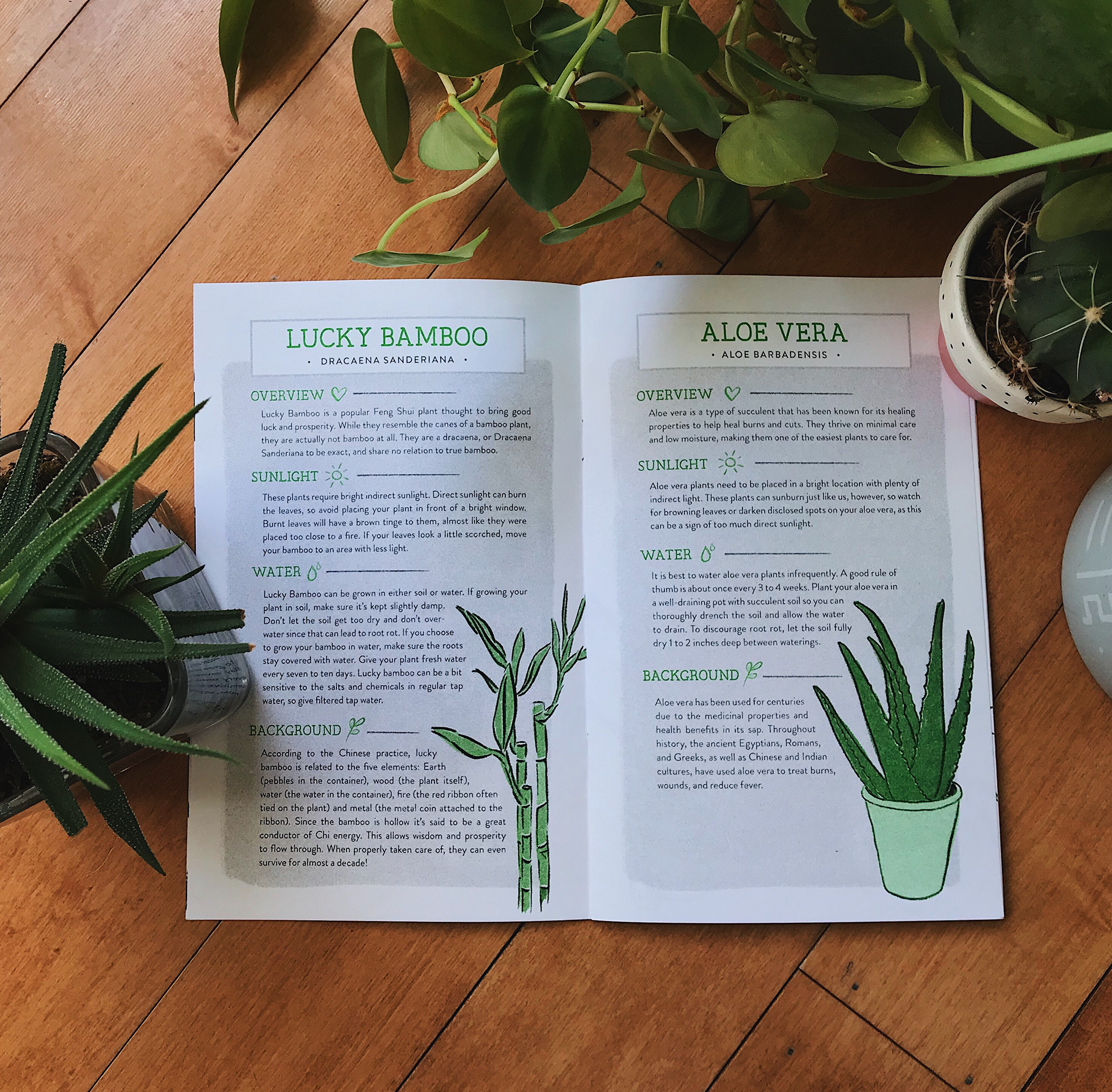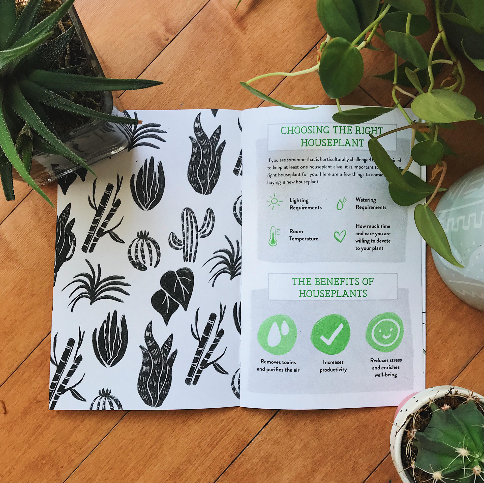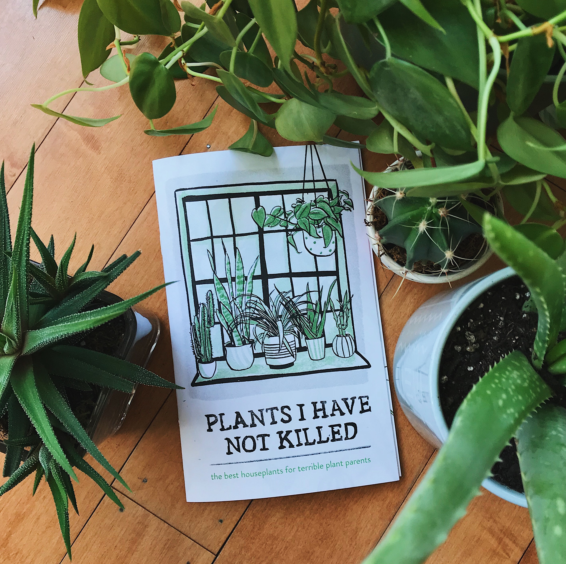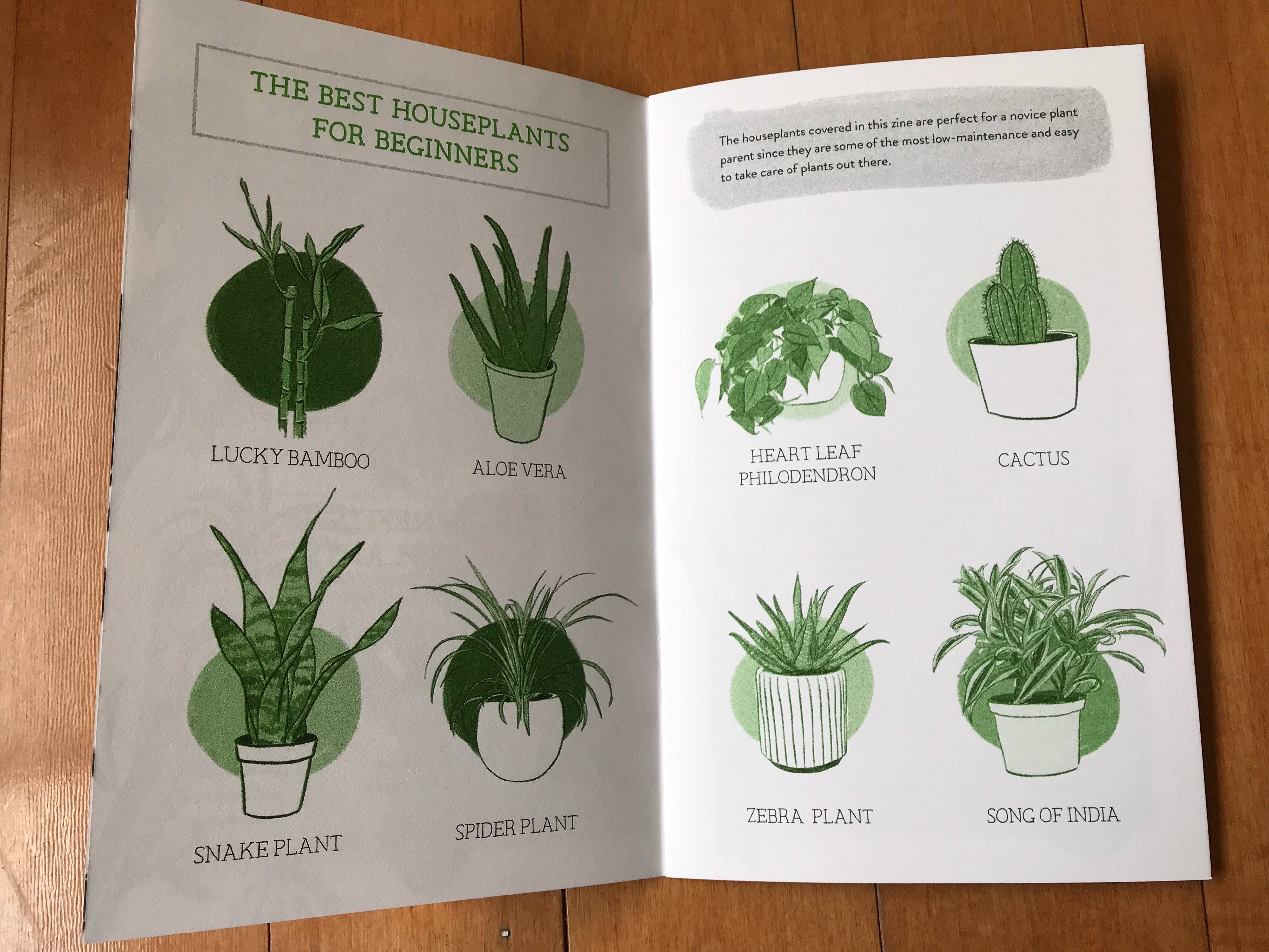 I chose the topic of a beginner's guide to plants for this zine. The title describes this zine best: Plants I Have Not Killed: The Best Houseplants for Terrible Plant Parents. Written by a self-proclaimed “formally horticulturally challenged plant parent,” the zine is an illustrated beginner's guide to researching, buying, and keeping alive a new plant. Each page highlights an easy-to-care-for plant by providing information about its sunlight and water needs, as well as a brief background about the plant.