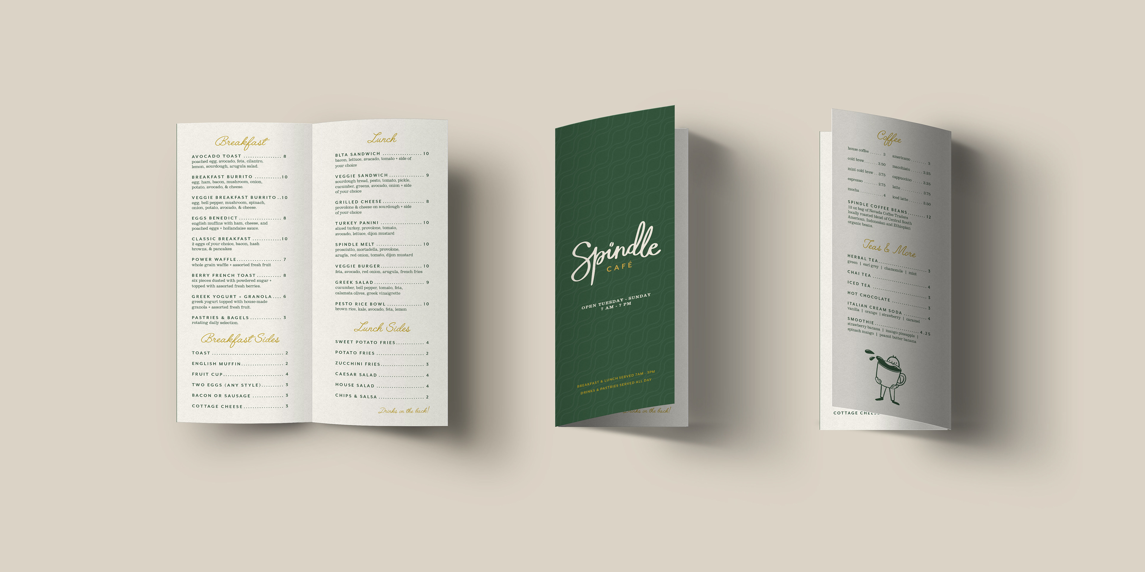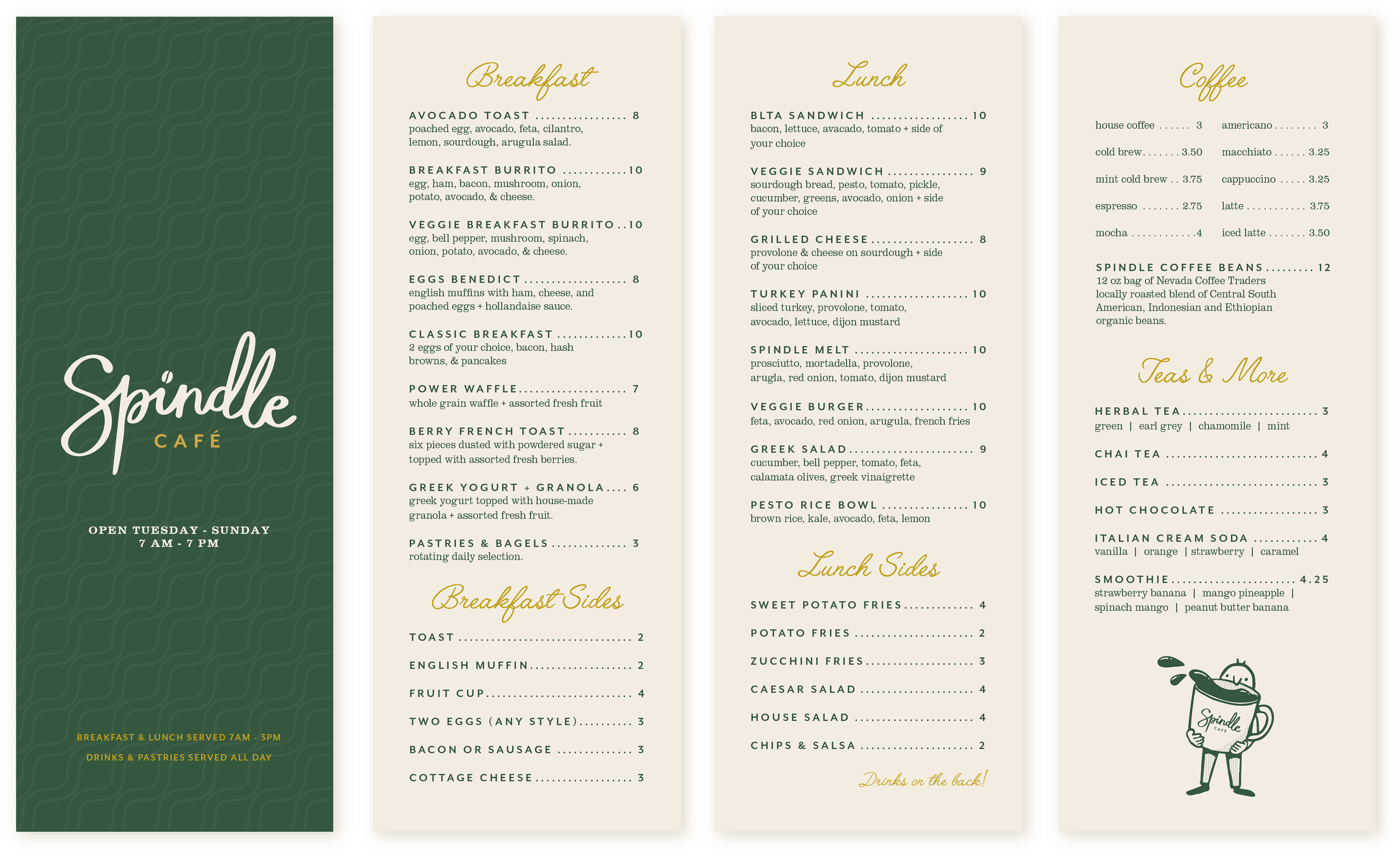 The Spindle Café is a brand identity concept. It is a small, fictional café located in Reno, Nevada. The café specializes in quality coffee, food, and pastries that are made in-house with locally sourced ingredients. Whether it’s a quick coffee to-go or a meal with friends, the Spindle Café is a place to unwind and enjoy quality coffee, food, and people.