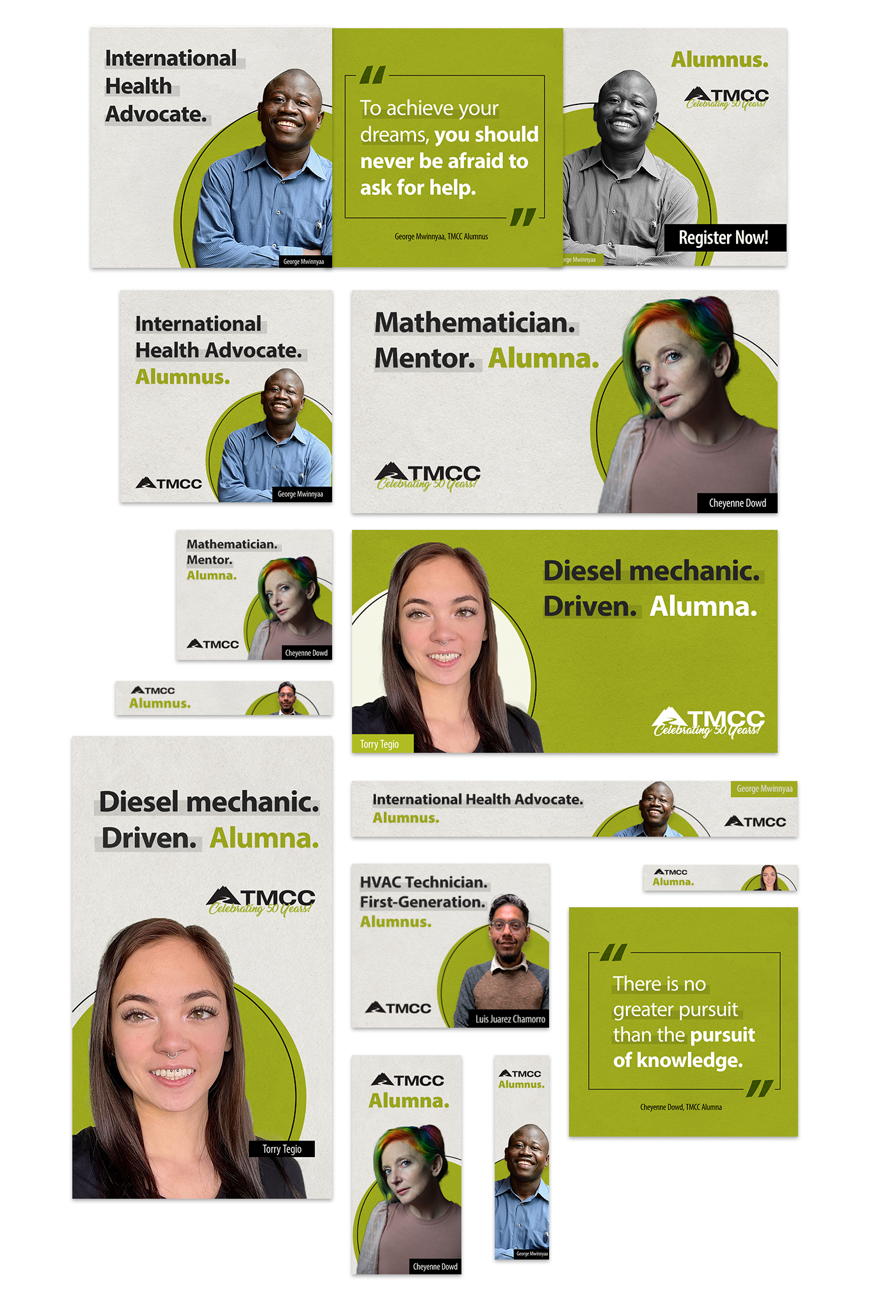 Each ad features TMCC alumni with their names and photo, as well as adjectives that describe who they are and how TMCC helped them get there. Twelve different digital ad sizes were created for each TMCC alumni. The digital ads ran on various social media platforms and digital display locations throughout April and May 2022.
