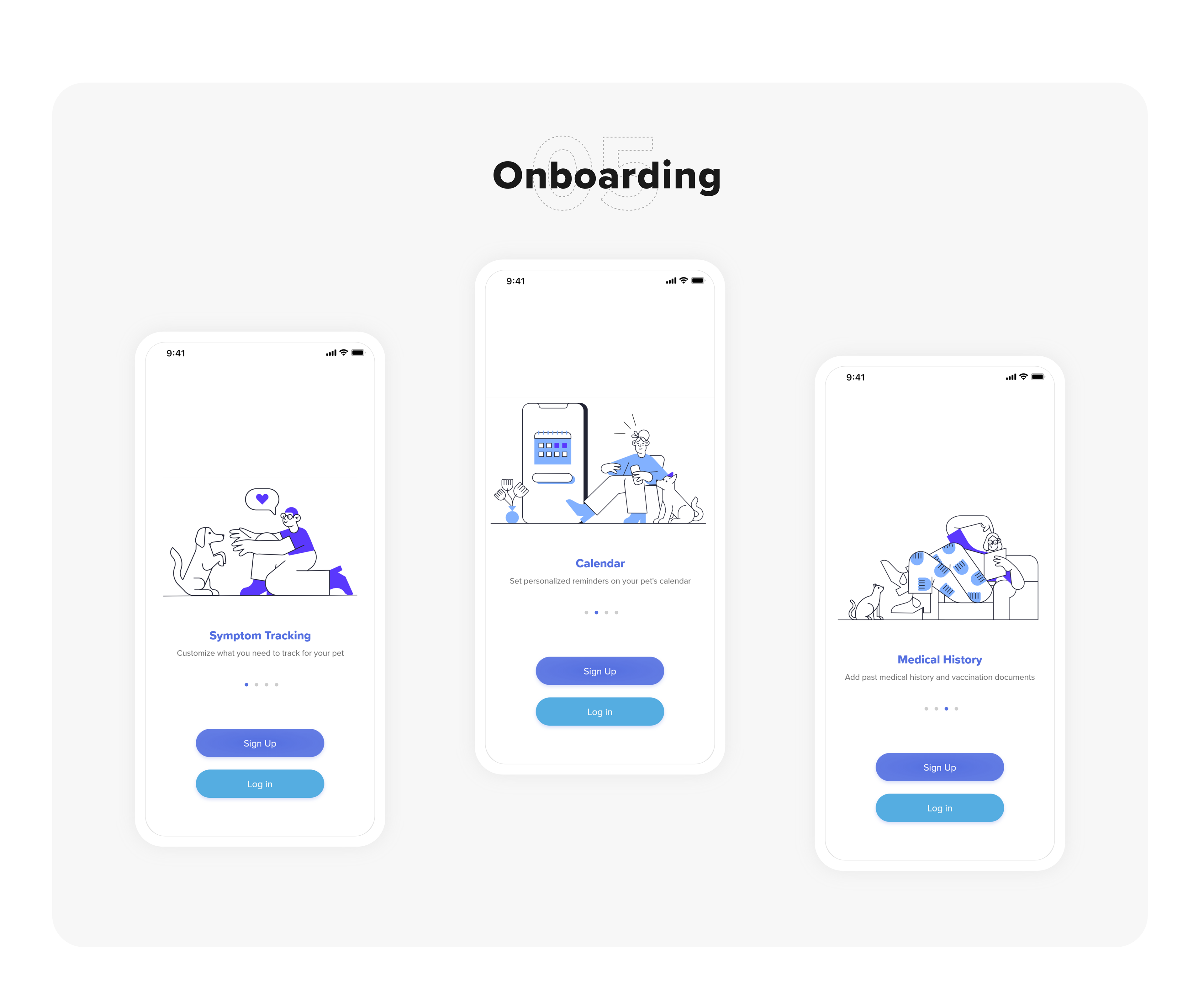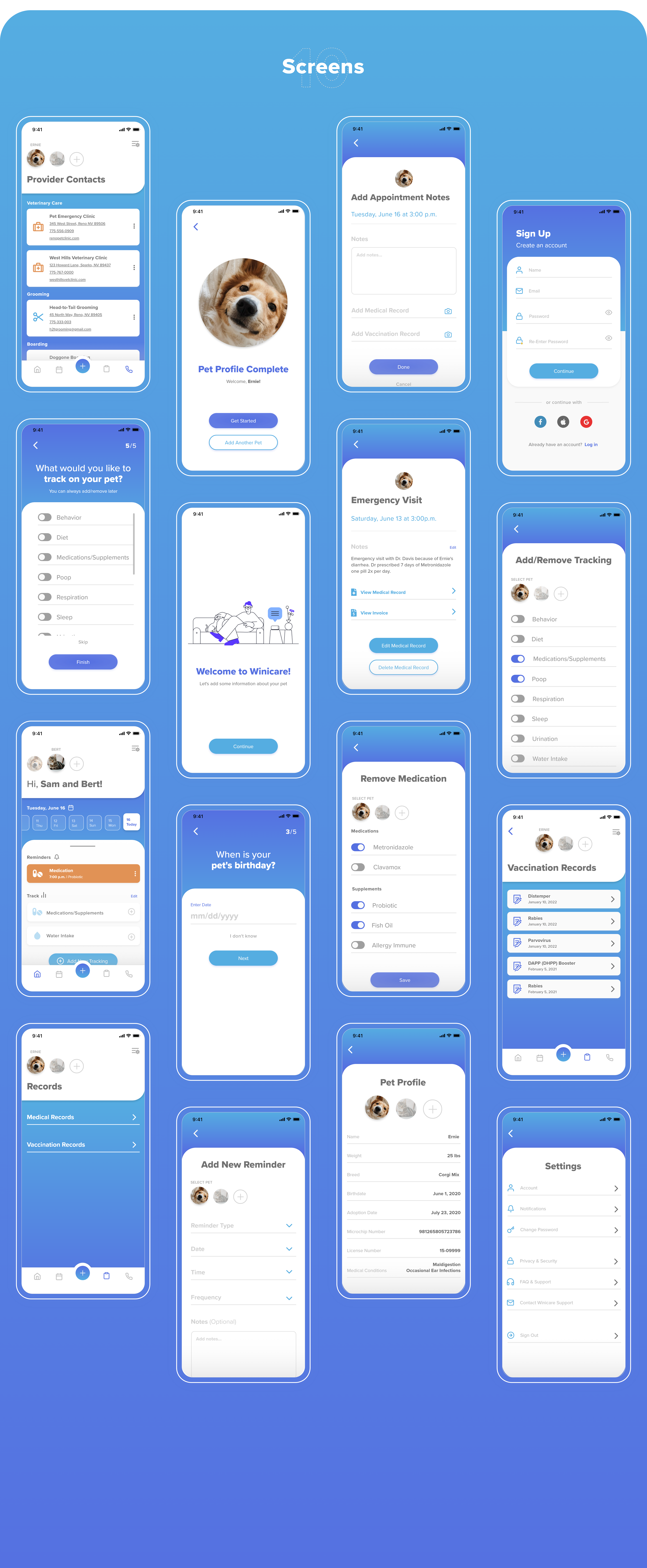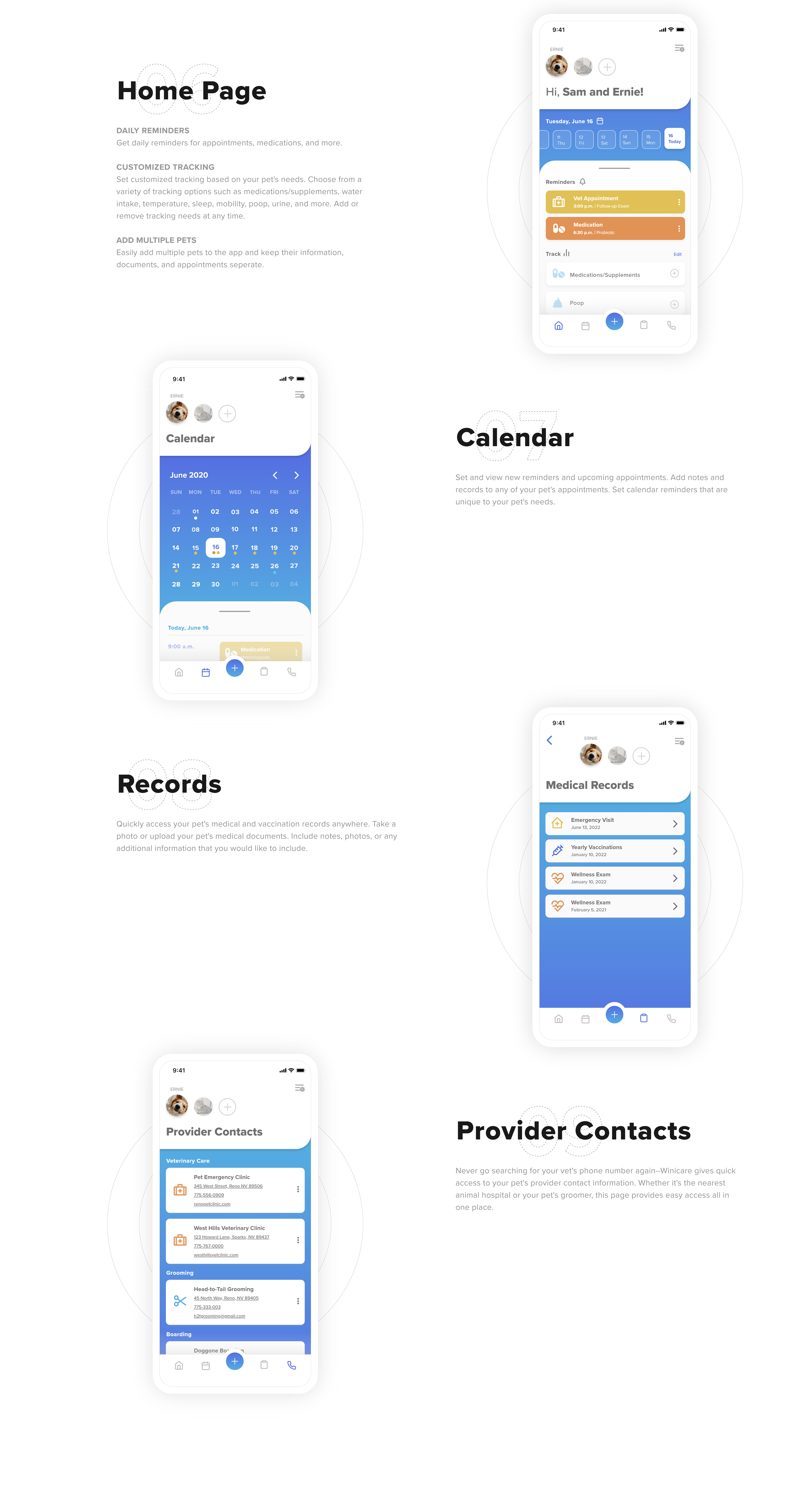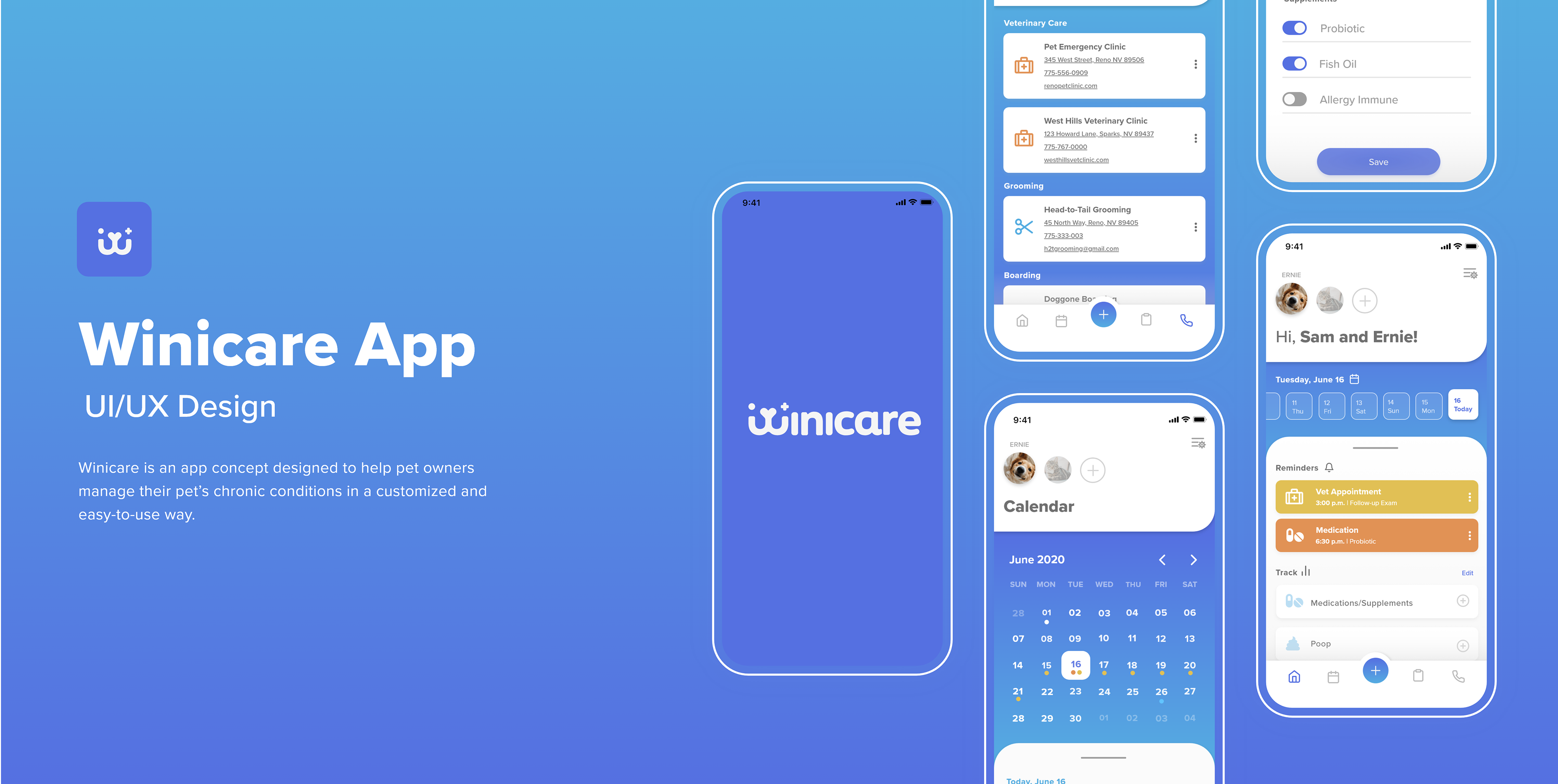 Winicare is a tool to help manage a pet’s chronic illness. It is an app concept designed to help pet owners manage their pet’s chronic conditions in a personalized and easy-to-use way. Rather than a generalized health tracking app for pets, Winicare offers features that are personalized and specific to the pet’s needs. Having a pet with a chronic illness is challenging enough—Winicare helps to give pet owners the confidence and tools they need to care for their pets.